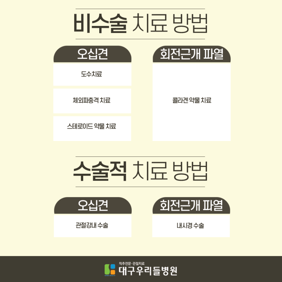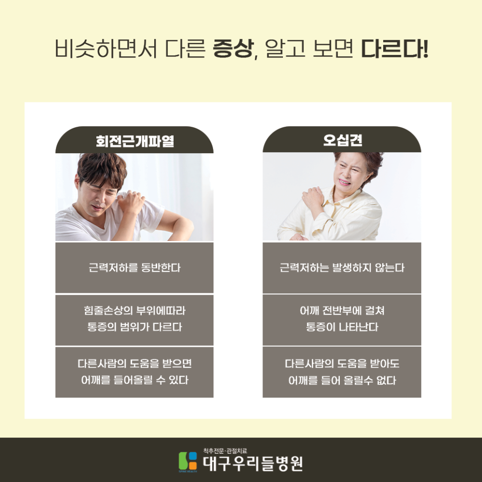 안녕하세요 대구 우리들 병원입니다나타나는 증상부터 치료 방법까지 비슷하지만 전혀 다른 두 질환, 회전근개파열과 오십견 비교 시간을 갖도록 하겠습니다!