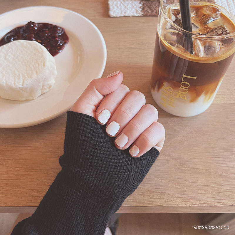 화이트 풀코트와 누디 핑크 풀코트, 여기에 화이트 하트 모노그램 패턴까지 더해져 평범해 보이지도 않고 컬러 자체가 고급스러워서 그런지 우아한 느낌도 들었지만 꾸미지 않은 네일을 좋아하는 나로서는 가장 좋아하는 네일 스티커였다 ♥ 물론 어디에나 찰떡같이 잘 어울리는 헤헤